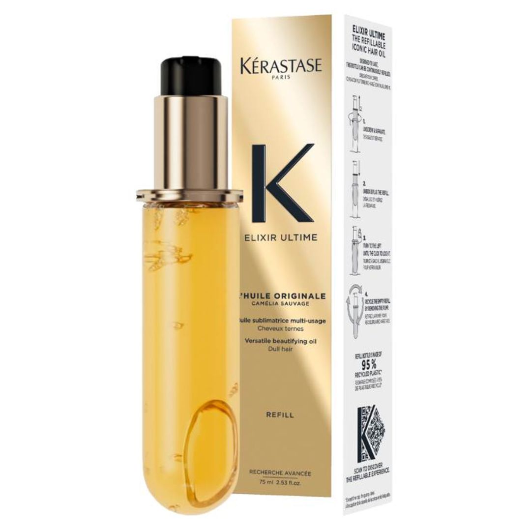 El Aceite L'Huile Originale es de la marca profesional francesa Kérastase. Se presenta en un formato recargable y sostenible, que garantiza un rendimiento avanzado en todo tipo de cabello. Con su textura ligera, protege el cabello, dejándolo más suave, sedoso y brillante.
