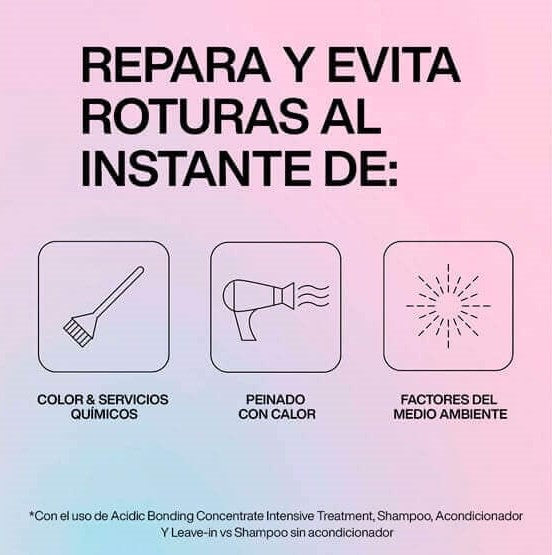 Tratamiento intensivo previo al shampoo, con enjuague para todo tipo de cabellos y texturas incluso los más dañados y procesados. Proporciona reparación de fuerza en un solo uso. Máxima concentración de Bonding Care Complex para una reconstrucción total del cabello desde el interior en tan solo 5-10 minutos. Su formulación ayuda a fortificar los enlaces debilitados para mejorar la fuerza y la resistencia del cabello después de los servicios de decoloración o coloración. abc